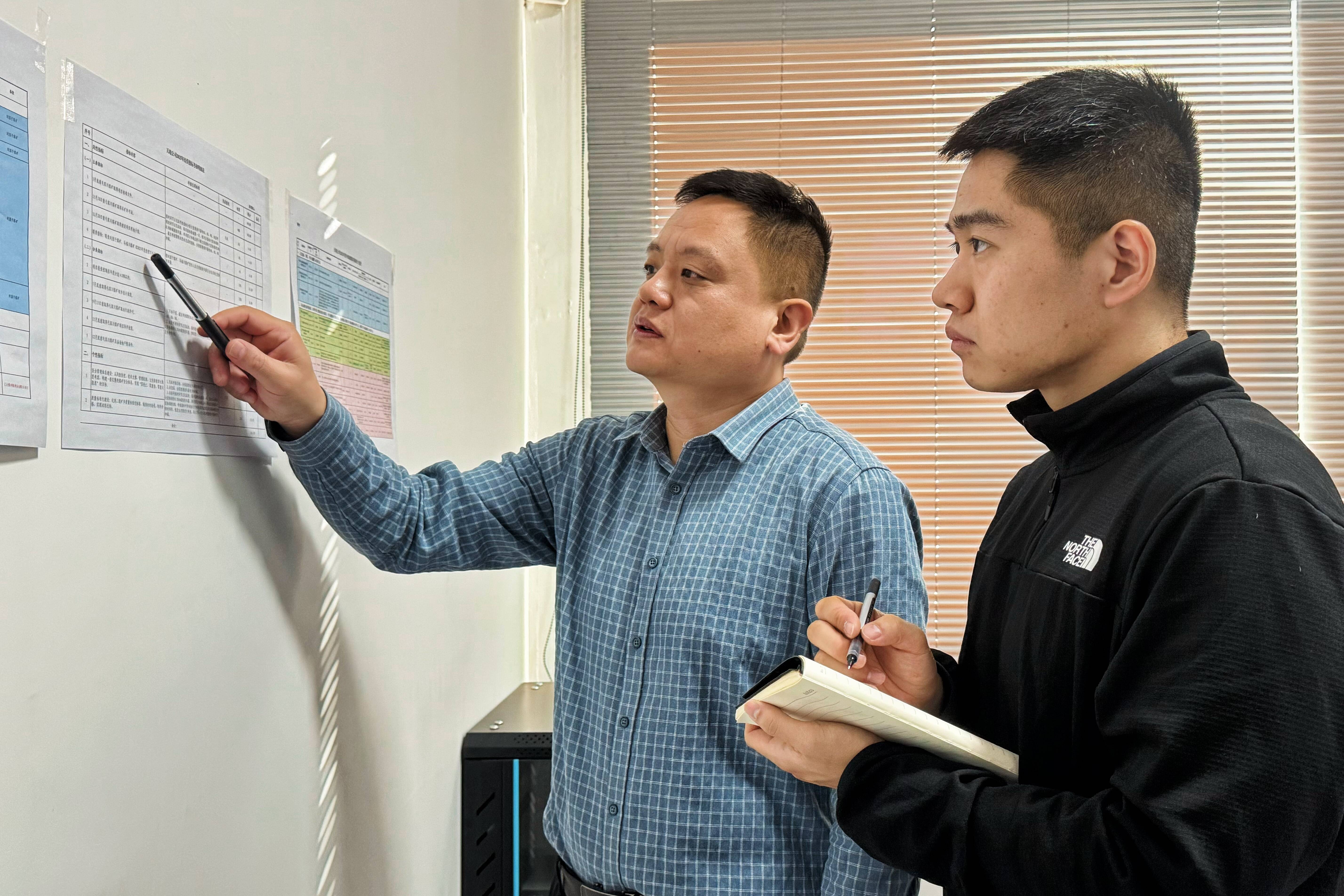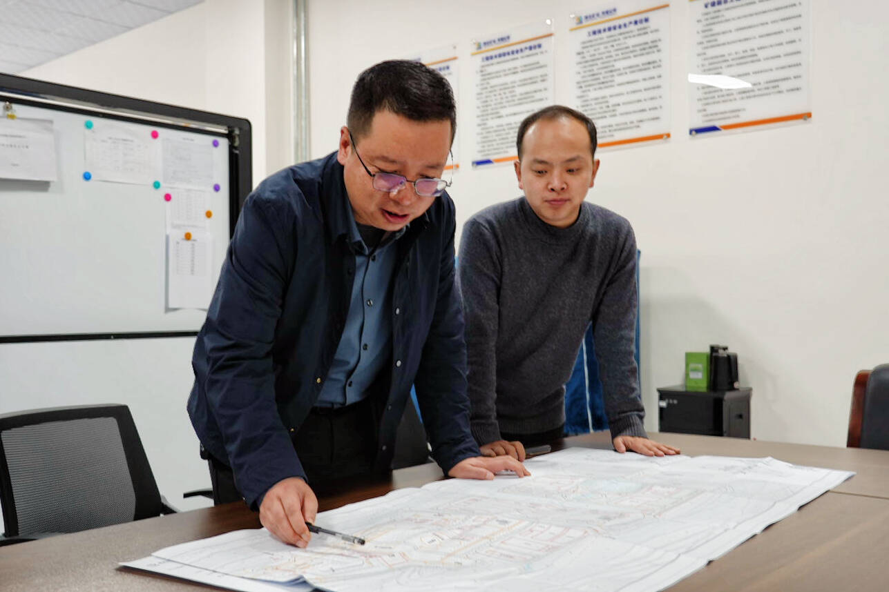 深夜的天竣公司工程技术部灯火通明,一张张图纸铺满长桌,技术攻坚小组的目光反复聚焦在马福川煤矿井底煤仓检修巷的剖面图上,空气中弥漫着专注与思索的气息。