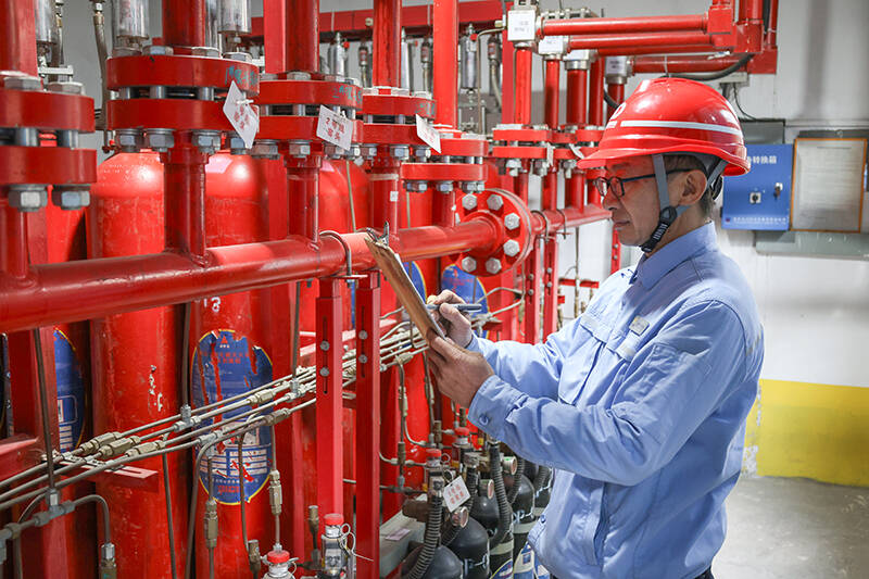 (职工在现场检查消防设施)